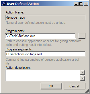 Configure the action that will delete all existing tags in selected text, turning it into a simple plain text. Let's use the sed utility and following file sed-script "no-tags.sed". :a s/<[^>]*>//g /</N //ba Check the script at the command prompt, and then connect the new operation to TextLab as shown in the image on the left. |