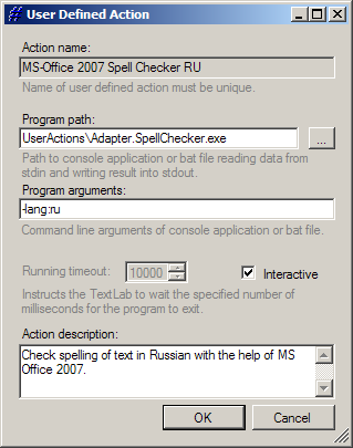 Above, see Help for the command-line options for the console application. Usually in the options need to specify the language checked text. Option LangID: is specified in the custom action settings dialog box, as shown in the picture on the left. Note that because the spell-checking requires interaction with the user in the process of its performance, you must set the flag Interactive. |
