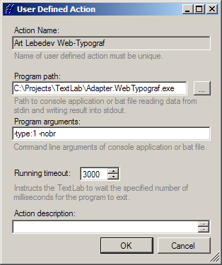 Let's use Web-typograph published by Art Lebedev studio for free using. From our website you can download the console application Adapter.WebTypograf.exe and use it free of charge for yours needs. You can use this application to create a custom action for TextLab. Thus a Web-typograph becomes available when you work with any text editor on your computer.