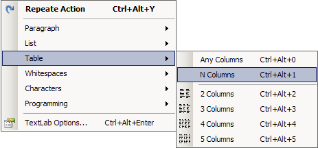 If you most often use tables with certain quantity of columns (for example more often, your columns have 3 columns) to you this quantity of columns value by default will be convenient to make. Will carry out construction of such tables easier, pressing, a combination Ctrl+Alt+1 (operation N Columns ).